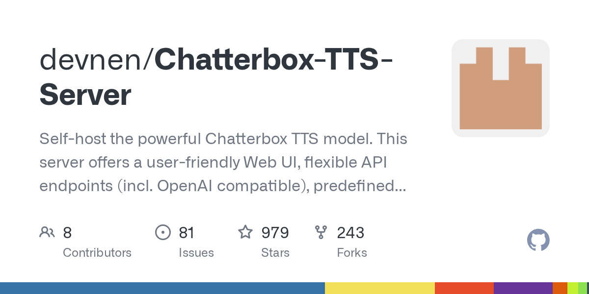 Self-host the powerful Chatterbox TTS model. This server offers a user-friendly Web UI, flexible API endpoints (incl. OpenAI compatible), predefined voices, voice cloning, and large audiobook-scale text processing. Runs accelerated on NVIDIA (CUDA), AMD (ROCm), and CPU.