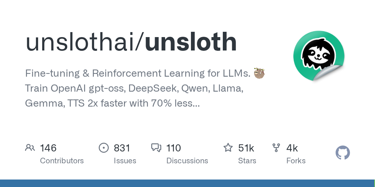 Fine-tuning & Reinforcement Learning for LLMs. 馃Ε Train OpenAI gpt-oss, DeepSeek, Qwen, Llama, Gemma, TTS 2x faster with 70% less VRAM.