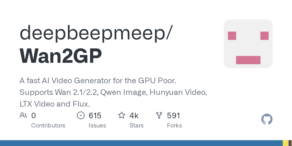 GitHub - deepbeepmeep/Wan2GP: A fast AI Video Generator for the GPU Poor. Supports Wan 2.1/2.2, Qwen Image, Hunyuan Video, LTX Video and Flux.