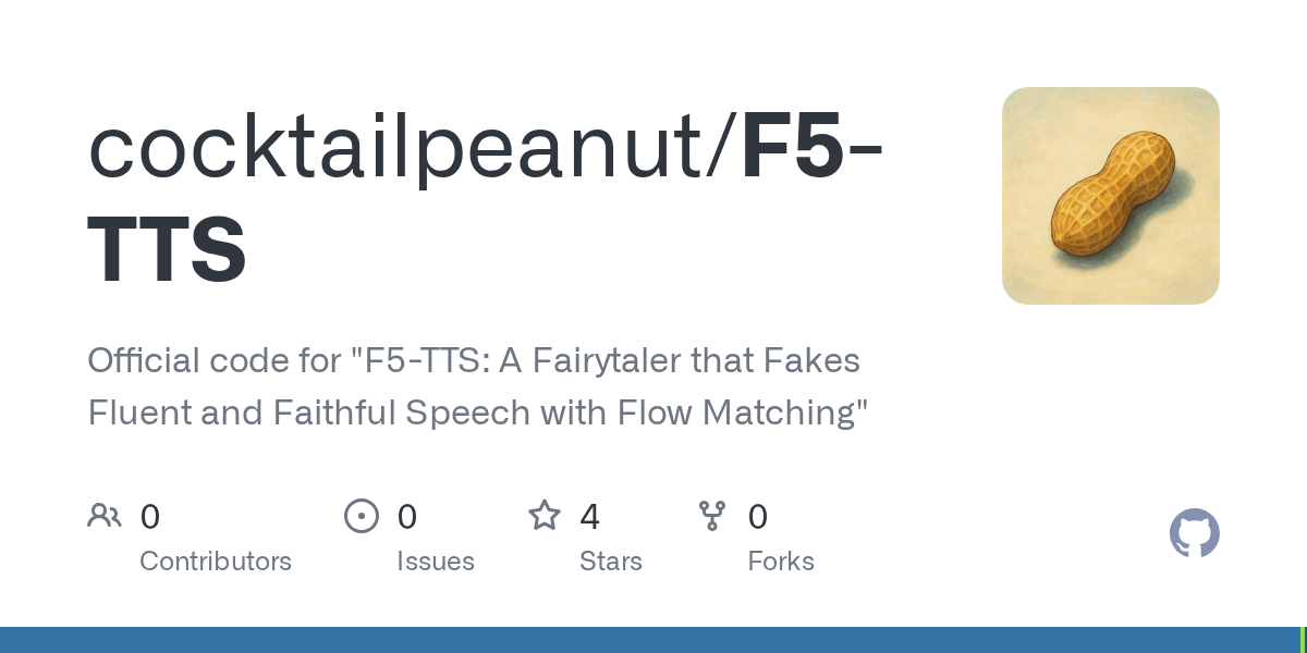 https://github.com/cocktailpeanut/f5-ttsupdated 11/10/2024, 8:29:25 PMindexed 1/30/2026, 12:19:44 PM