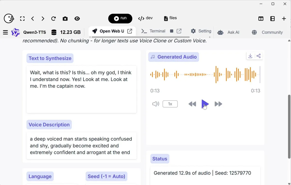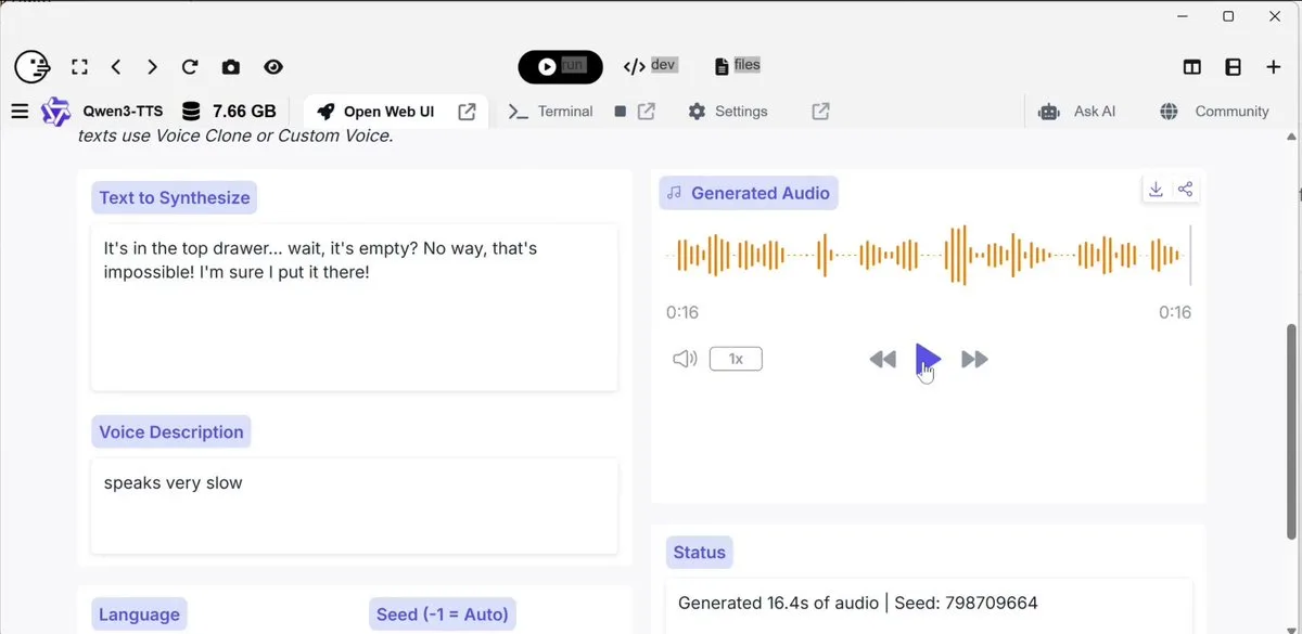 Post1/24/2026, 1:16:55 AM@cocktailpeanutposted inQwen3-TTSSophisticated voice prompting with Qwen3-TTS0 comments#ai#qwen3-tts#ttsWow Qwen3-TTS is crazy good and so interesting. Listen to this guy go through the whole emotional journey -- starting confused, having an...