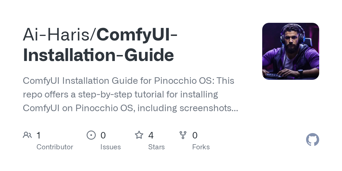 ComfyUI Installation Guide for Pinocchio OS: This repo offers a step-by-step tutorial for installing ComfyUI on Pinocchio OS, including screenshots and instructions. It covers downloading the OS, installing ComfyUI, setting up dependencies like CUDA, and testing the installation. Contributions are welcome!