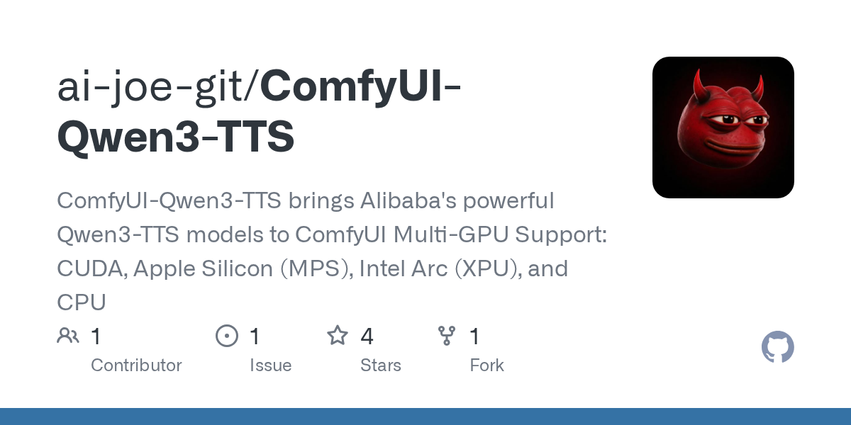 ComfyUI-Qwen3-TTS brings Alibaba's powerful Qwen3-TTS models to ComfyUI Multi-GPU Support: CUDA, Apple Silicon (MPS), Intel Arc (XPU), and CPU