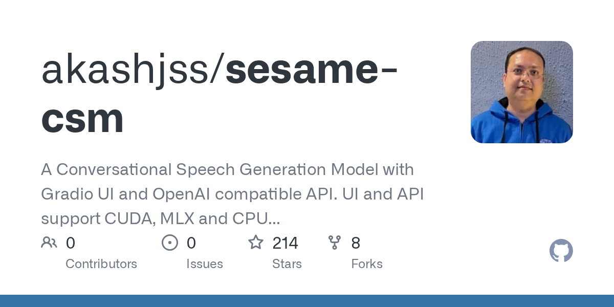 A Conversational Speech Generation Model with Gradio UI and OpenAI compatible API. UI and API support CUDA, MLX and CPU devices.