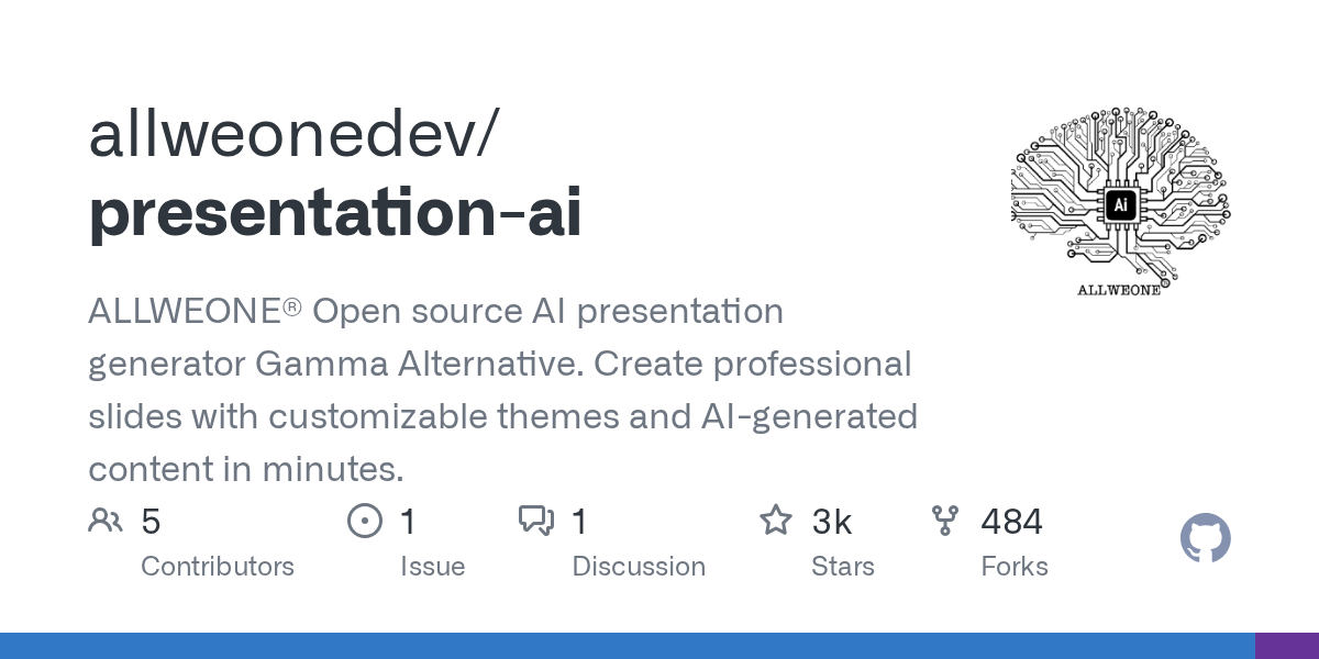 ALLWEONE® Open source AI presentation generator Gamma Alternative. Create professional slides with customizable themes and AI-generated content in minutes.