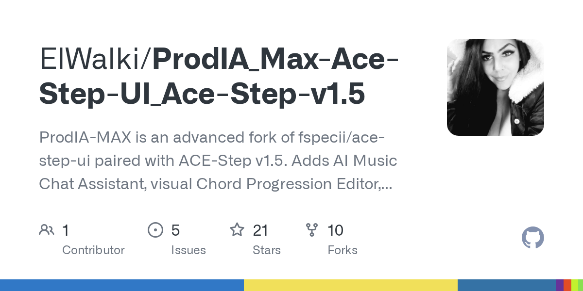 ProdIA-MAX is an advanced fork of fspecii/ace-step-ui paired with ACE-Step v1.5. Adds AI Music Chat Assistant, visual Chord Progression Editor, floating LoRA Manager, Demucs vocal separation, automatic ID3 tagging, full i18n support (EN/ES/ZH/JA/KO), extended presets, section-by-section generation, and multiple backend reliability fixes.
