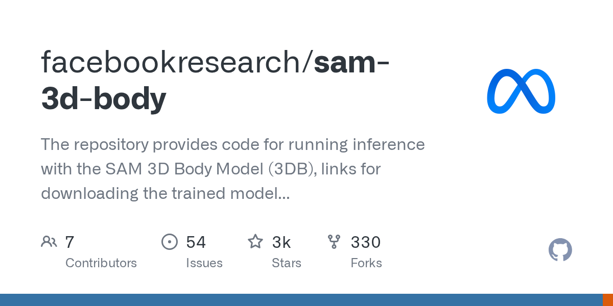 The repository provides code for running inference with the SAM 3D Body Model (3DB), links for downloading the trained model checkpoints and datasets, and example notebooks that show how to use the model.