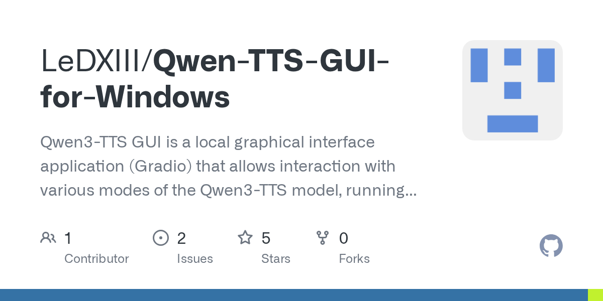 Qwen3-TTS GUI is a local graphical interface application (Gradio) that allows interaction with various modes of the Qwen3-TTS model, running on Windows.