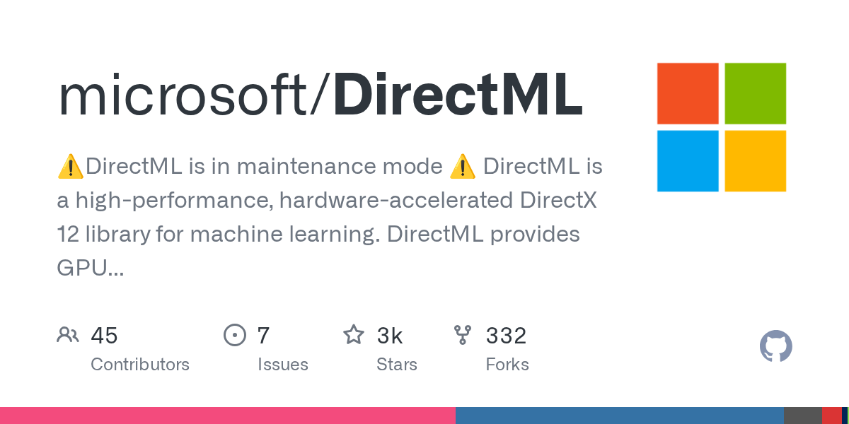 ⚠️DirectML is in maintenance mode ⚠️ DirectML is a high-performance, hardware-accelerated DirectX 12 library for machine learning. DirectML provides GPU acceleration for common machine learning tasks across a broad range of supported hardware and drivers, including all DirectX 12-capable GPUs from vendors such as AMD, Intel, NVIDIA, and Qualcomm.