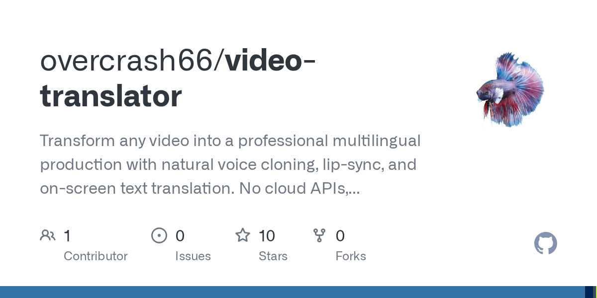 Transform any video into a professional multilingual production with natural voice cloning, lip-sync, and on-screen text translation. No cloud APIs, no subscriptions, no data leaving your machine.