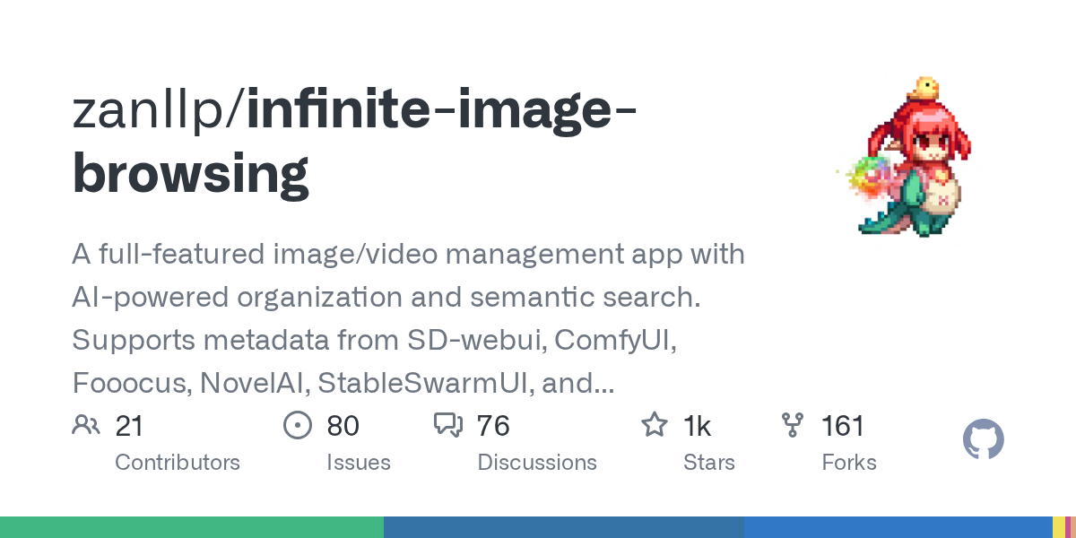 A full-featured image/video management app with AI-powered organization and semantic search. Supports metadata from SD-webui, ComfyUI, Fooocus, NovelAI, StableSwarmUI, and more. Available as standalone app, SD-webui extension, or library.