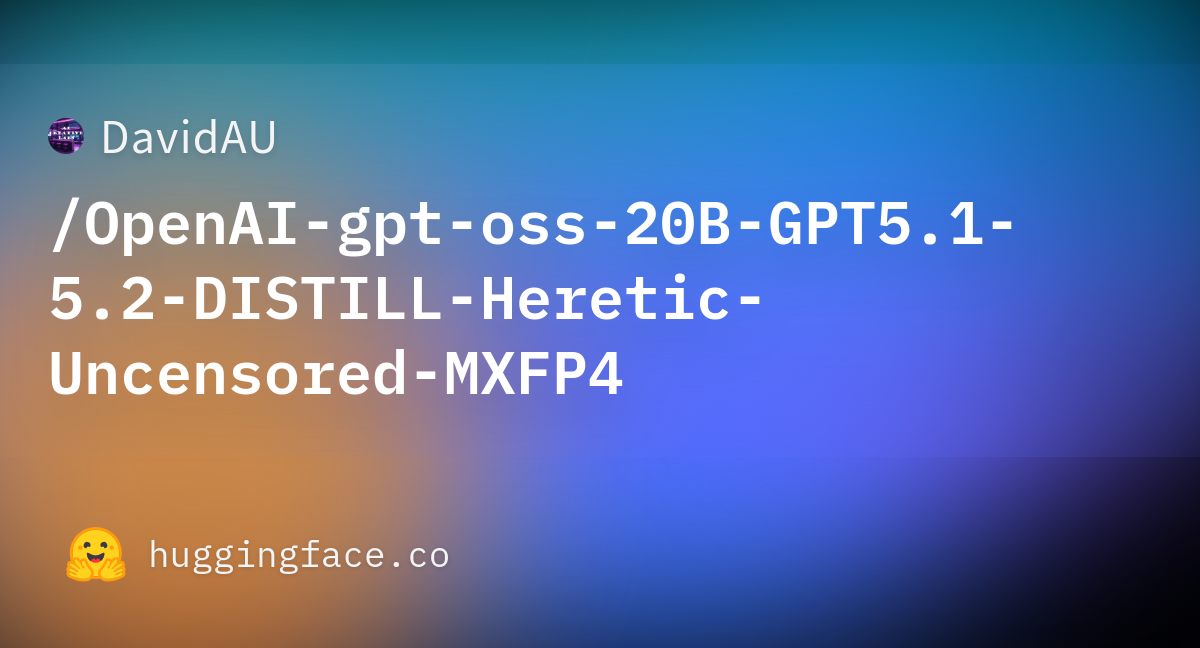 DavidAU/OpenAI-gpt-oss-20B-GPT5.1-5.2-DISTILL-Heretic-Uncensored-MXFP4 · Hugging Face