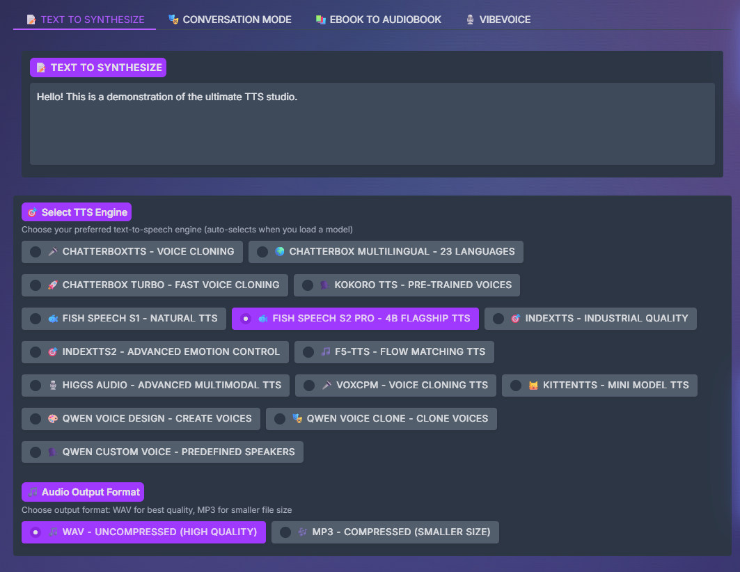 Fish-Speech S2 Pro@sup3rmass1ve3/11/2026, 10:53:41 PMNow in Ultimate TTS Studio, Discussion (0)WritePreviewAdd mediaUp to 10 files, 25MB each. Images are optimized; GIFs -> MP4; videos 720p (max 120s).Comment