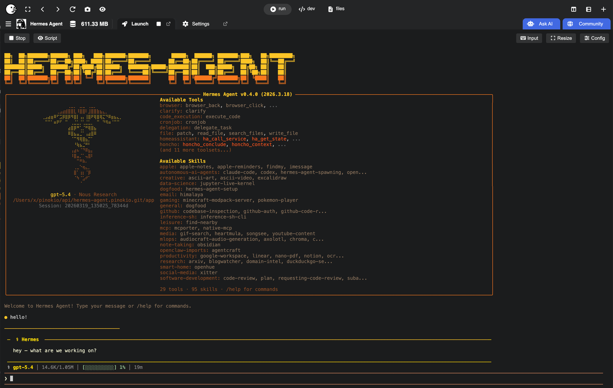 And here i am asking Hermes agent to run video generation. Hermes automatically starts talking to Pinokio, finds the relevant app (#Wan2GP), launches it when not already launched, and then makes a request, and then returns the video.