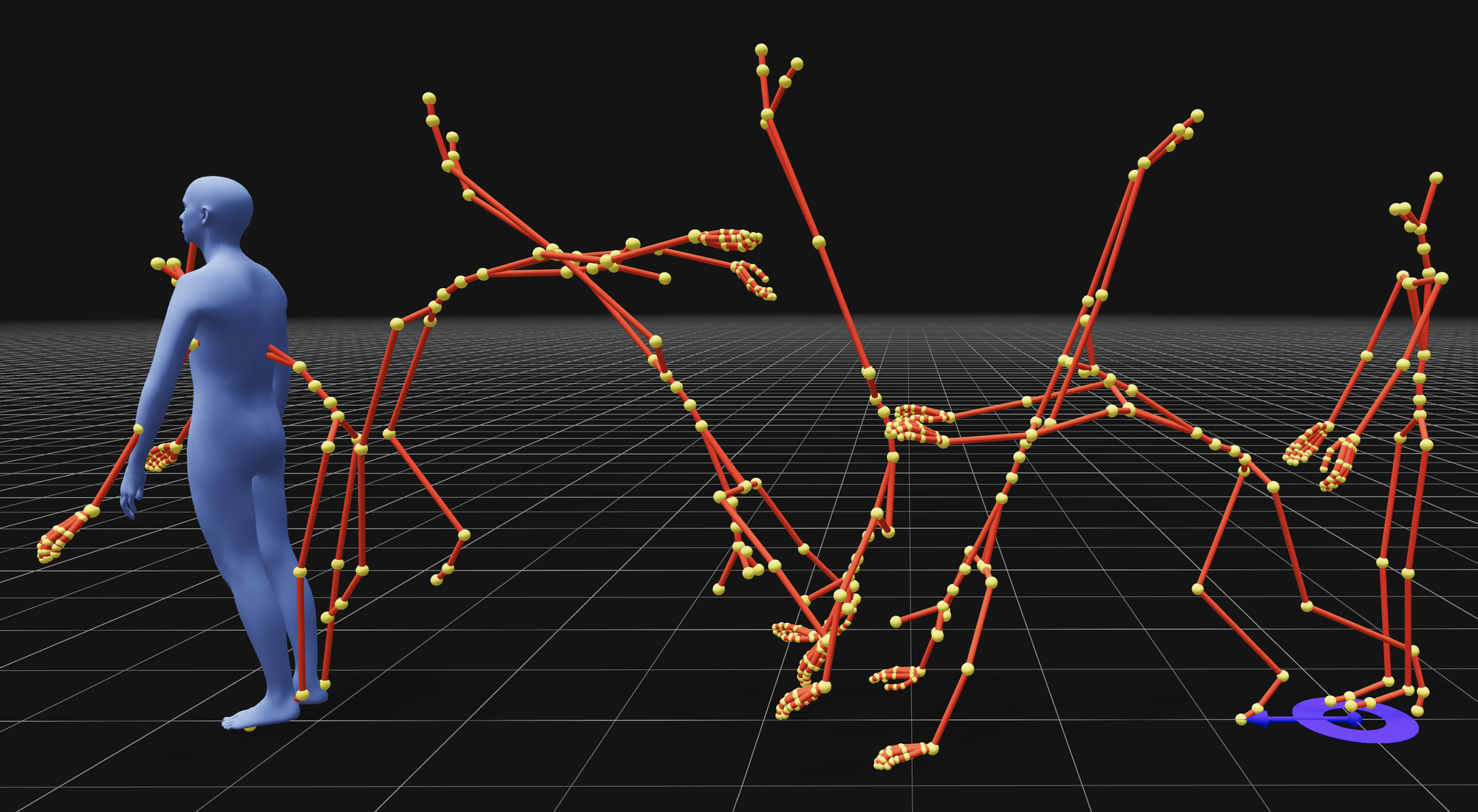 If you need more complex movements, the model is'nt trained on, or generates motions of poor quality, you can use constraints to tell the model where to be or which pose you want at a certain point on the timeline. The model will fill the gap between these constraints when you generate the motion.