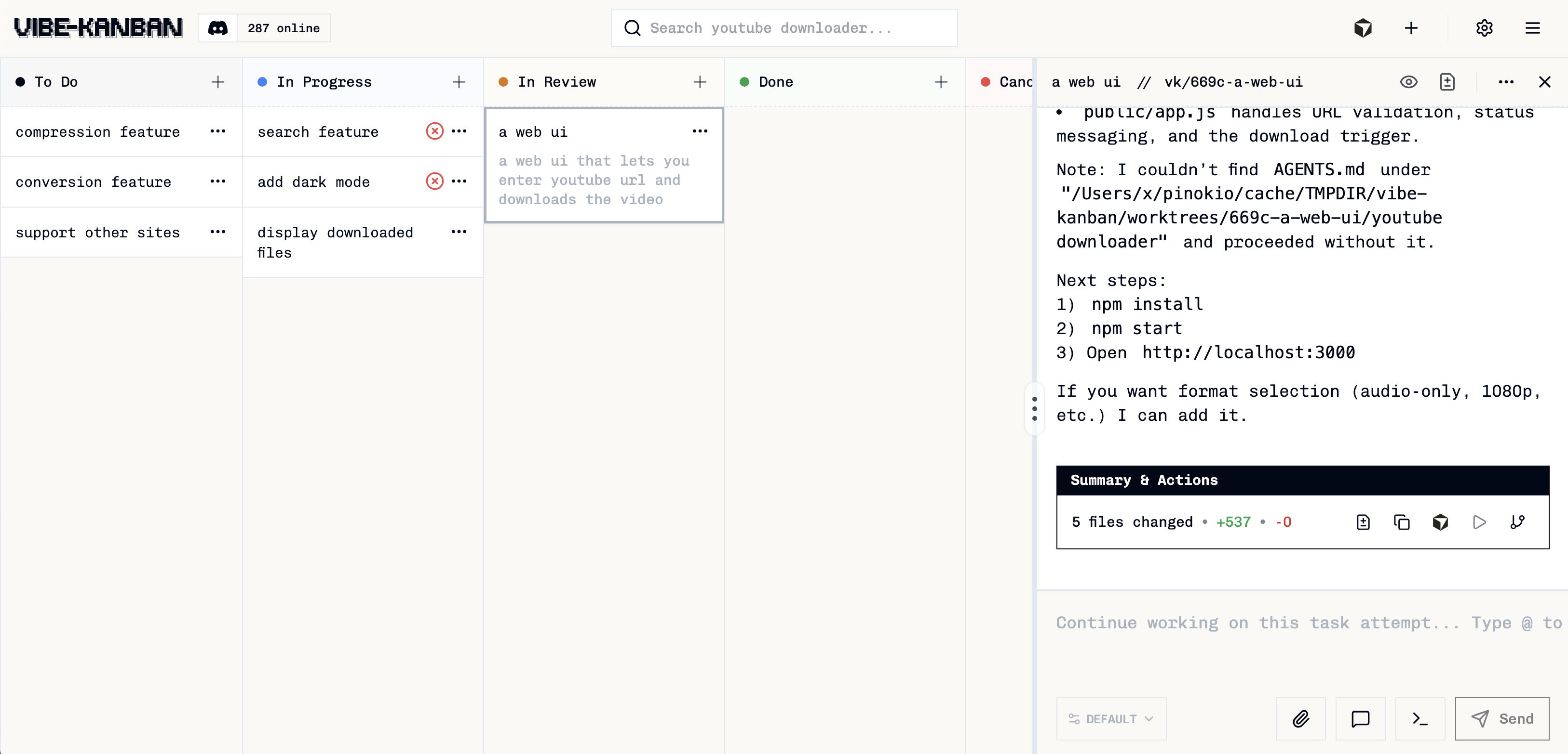 Check-in2/2/2026, 4:03:42 AM@cocktailpeanutchecked in toVibe Kanbansha256:2ce7af8f...691104f6•2 check-insConfirmed on darwin · x64 · amd radeon pro 5500mdarwinx64GPU: amd radeon pro 5500mRAM: 32 GBVRAM: 4 GBCommit messages (1)cocktailpeanut/vibe-kanban.pinokio—Update pinokio.jsa35720bpinokio · 2/2/2026Last by @cocktailpeanut•2/2/2026, 4:05:40 AM