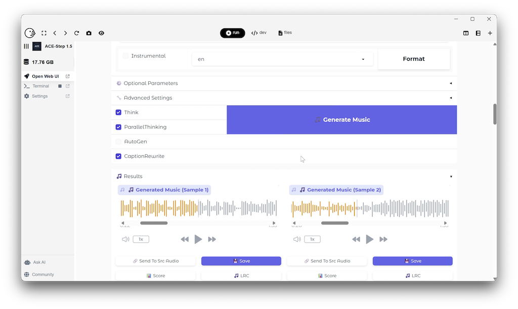 Check-in2/4/2026, 7:56:59 PM@cocktailpeanutchecked in toACE-Step 1.5sha256:27811582...f4f4d7db•1 check-inConfirmed on darwin · arm64 · apple m1 maxdarwinarm64GPU: apple m1 maxRAM: 64 GBCommit messages (2)cocktailpeanut/ace-step.pinokio—Update start.js for mac03cef0apinokio · 2/4/2026ace-step/ace-step-1.5(app)—Fix brocken HuggingFace link in READMEf689997Byron · 2/4/2026Last by @cocktailpeanut•2/4/2026, 7:56:59 PM