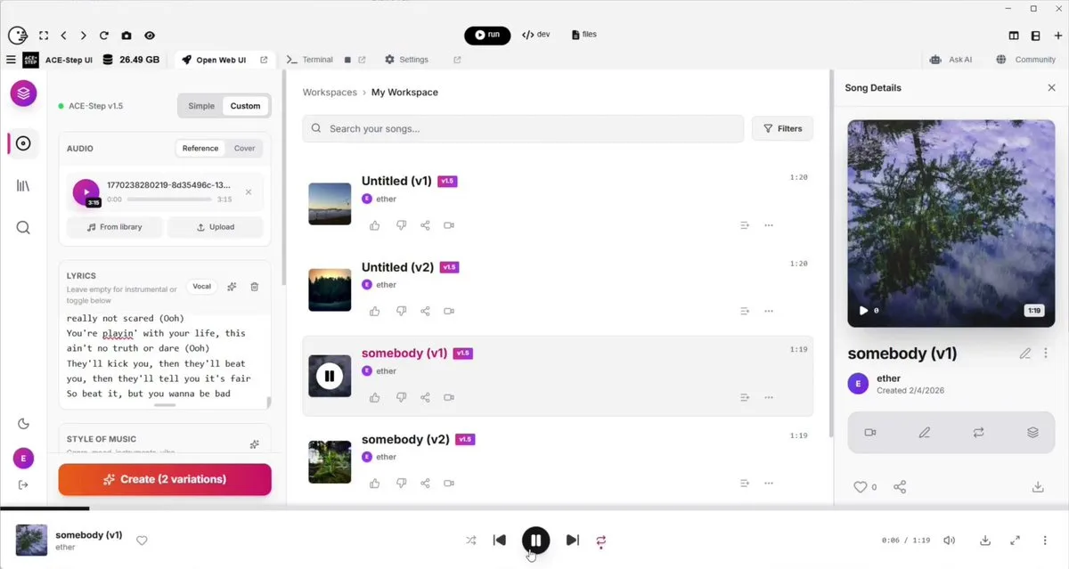 Check-in2/4/2026, 9:52:06 PM@cocktailpeanutchecked in toACE-Step UIsha256:1bfaa833...82e611e2•3 check-insConfirmed on win32 · x64 · nvidia rtx a4500win32x64GPU: nvidia rtx a4500RAM: 28 GBVRAM: 19 GBCommit messages (3)cocktailpeanut/ace-step-ui.pinokio—Merge branch 'main' of https://github.com/cocktailpeanut/ace-step-ui.pinokiofd598b6cocktailpeanut · 2/4/2026fspecii/ace-step-ui(app)—Fix storage upload to return public URL path823fbe0fspecii · 2/4/2026ace-step/ace-step-1.5(app/ACE-Step-1.5)—Merge pull request #128 from ace-step/optimize_env_installationc902774Sayo · 2/4/2026Last by @naked•2/6/2026, 2:12:26 AM